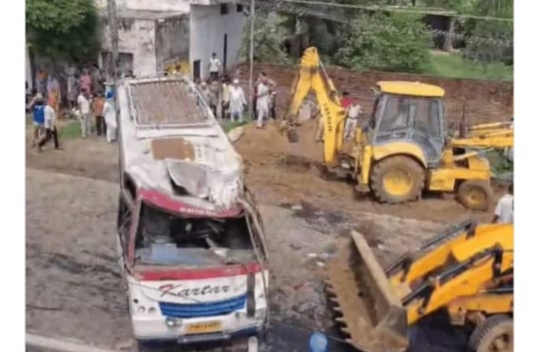 घटना के तुरंत बाद JCB की मदद से लोगो को बस से निकाला गया कार में सवार लोगो को मामूली चोटें आई हैं
